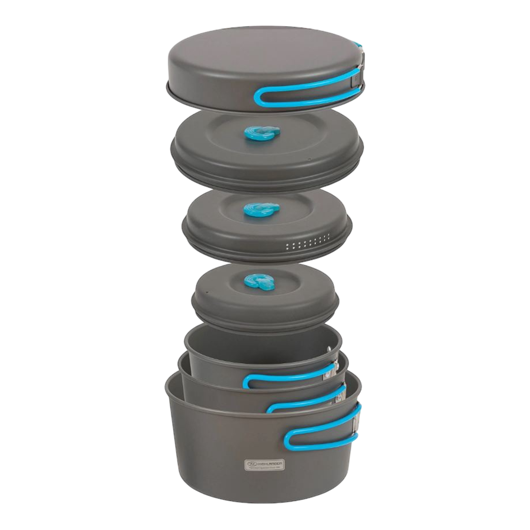 The Vertex cook set is a lightweight, compact and perfect for family or solo camping. With a robust construction and silicon handles for protection from the heat, they will handle the demands of the great outdoors without being damaged. Plus each set stores within itself in a carry bag for easy storage.